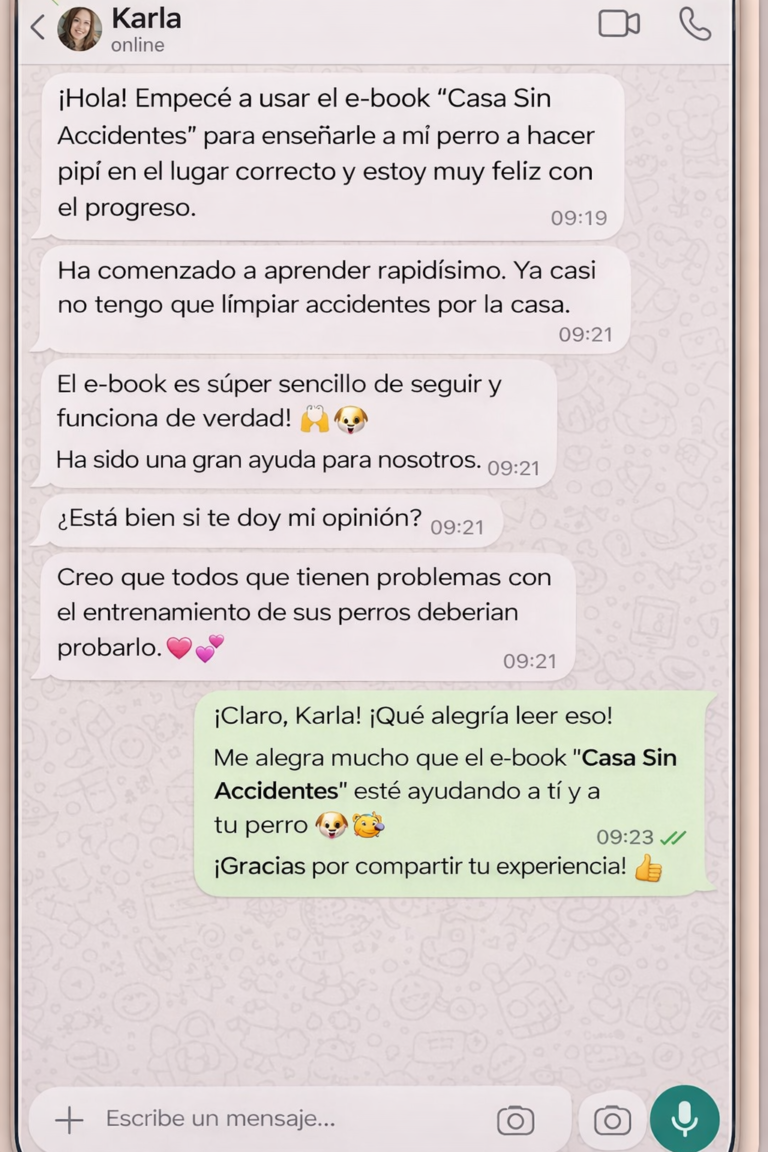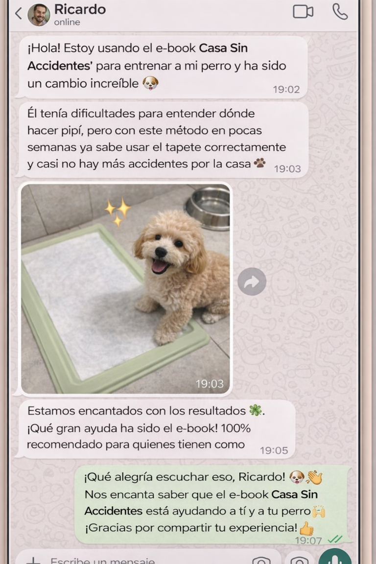 Enseñarle rutinas claras que tu perro entiende sin frustrarse Evitar accidentes incluso cuando cambian los horarios Corregir errores comunes que retrasan el aprendizaje Mantener los resultados a largo plazo Volver a disfrutar de tu casa sin estar en alerta constante 👉 Menos limpieza. Más tranquilidad.